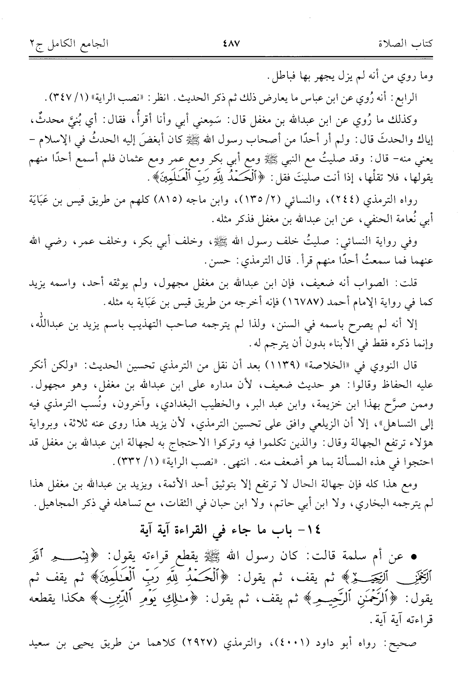 وممن صرَّح بهذا ابن خزيمة، وابن عبد البر، والخطيب البغداديّ، وآخرون، ونُسب الترمذيّ فيه إلى التساهل"، إِلَّا أن الزيلعي وافق على تحسين الترمذيّ، لأن يزيد هذا روى عنه ثلاثة، وبرواية هؤلاء ترتفع الجهالة وقال: والذين تكلموا فيه وتركوا الاحتجاج به لجهالة ابن عبد الله بن مغفل قد احتجوا في هذه المسألة بما هو أضعف منه. انتهى. "نصب الراية" (١/ ٣٣٢).