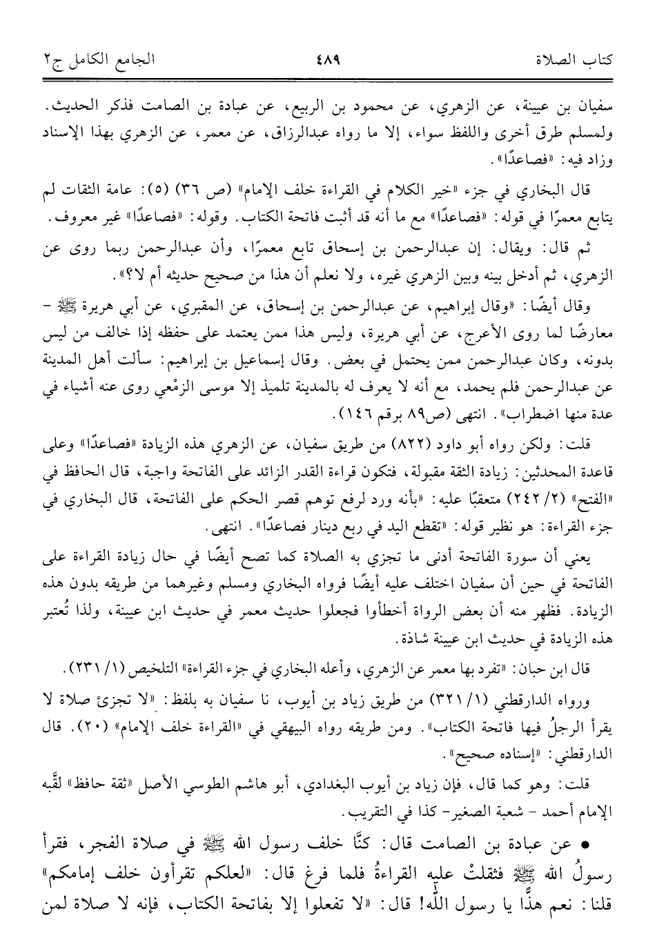 قلت: ولكن رواه أبو داود (٨٢٢) من طريق سفيان، عن الزهري هذه الزيارة "فصاعدًا" وعلى قاعدة المحدثين: زيادة الثقة مقبولة، فتكون قراءة القدر الزائد على الفاتحة واجبة، قال الحافظ في "الفتح" (٢/ ٣٤٢) متعقبًا عليه: "بأنه ورد لرفع توهم قصر الحكم على الفاتحة، قال البخاريّ في جزء القراءة: هو نظير قوله: "تقطع اليد في ربع دينار فصاعدًا". انتهى.