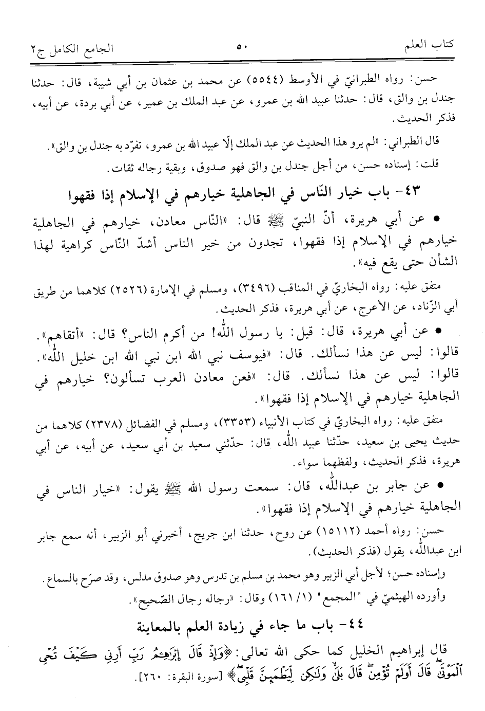 • عن جابر بن عبد اللَّه، قال: سمعت رسول اللَّه -صلى اللَّه عليه وسلم- يقول: "خيار الناس في الجاهلية خيارهم في الإسلام إذا فقهوا".
