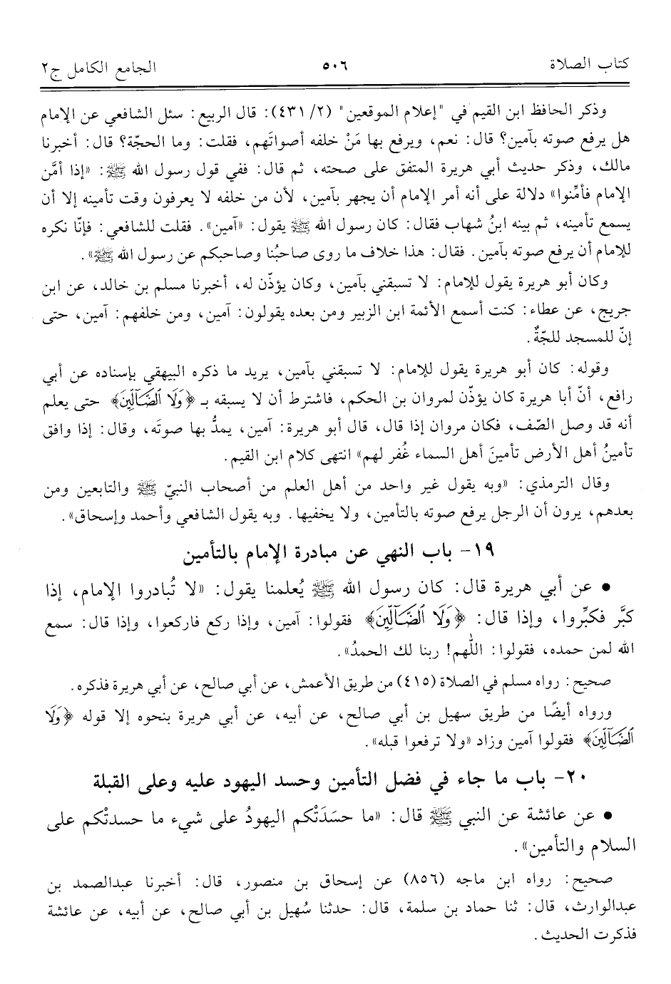وقال الترمذي: "وبه يقول غير واحد من أهل العلم من أصحاب النبي - صلى الله عليه وسلم - والتابعين ومن بعدهم، يرون أن الرجل يرفع صوته بالتأمين، ولا يخفيها. وبه يقول الشافعي وأحمد وإسحاق".