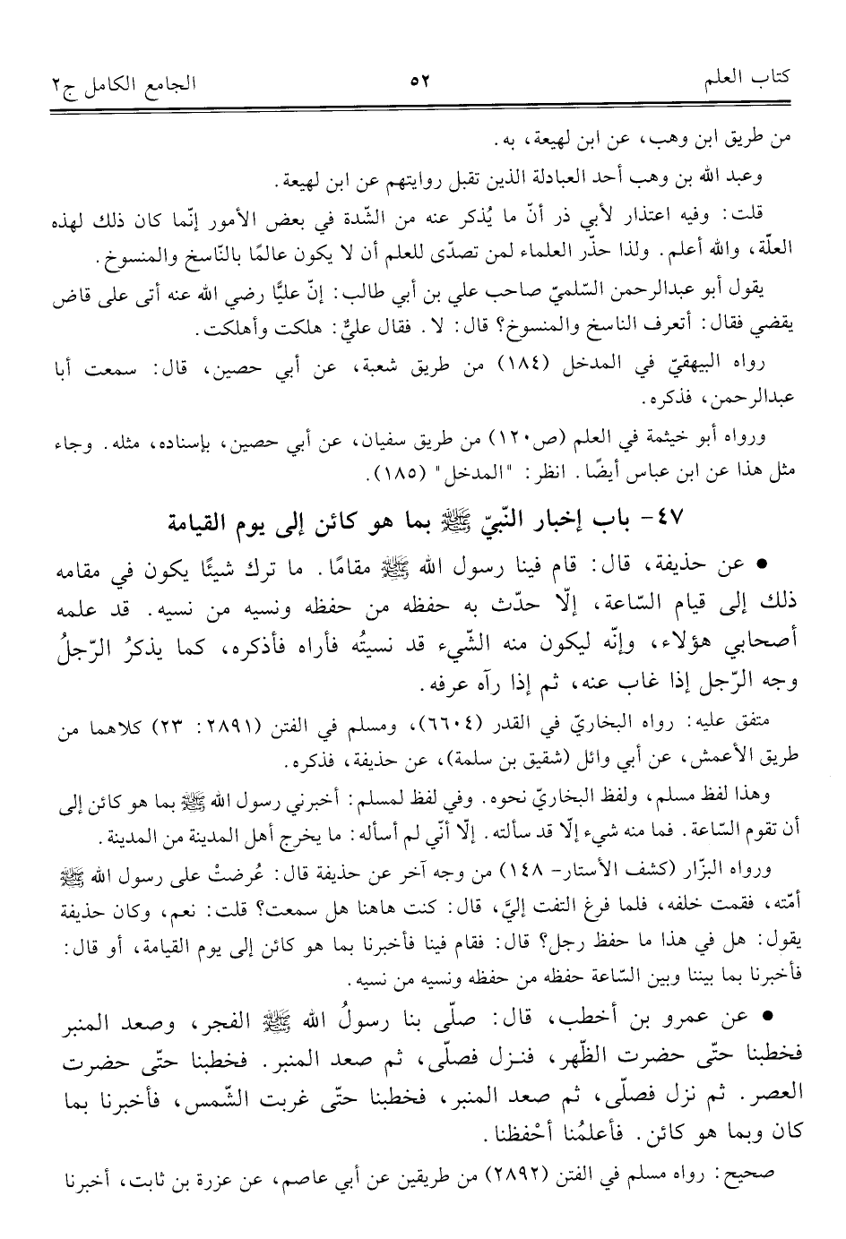• عن حذيفة، قال: قام فينا رسول اللَّه -صلى اللَّه عليه وسلم- مقامًا. ما ترك شيئًا يكون في مقامه ذلك إلى قيام السّاعة، إلّا حدّث به حفظه من حفظه ونسيه من نسيه. قد علمه أصحابي هؤلاء، وإنّه ليكون منه الشّيء قد نسيتُه فأراه فأذكره، كما يذكرُ الرّجلُ وجه الرّجل إذا غاب عنه، ثم إذا رآه عرفه.