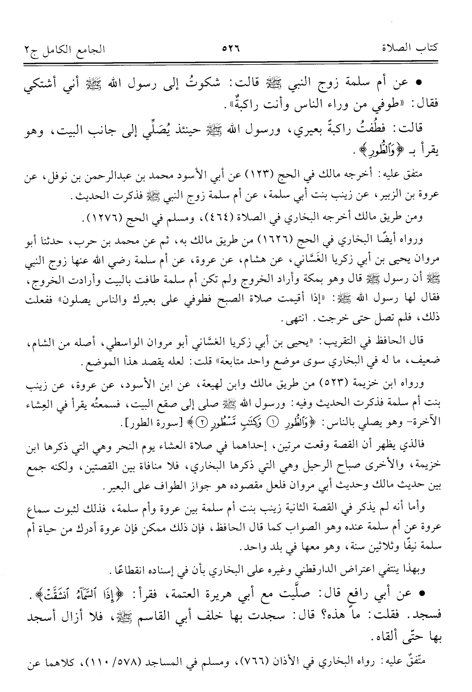 • عن أم سلمة زوج النبي صلى الله عليه وسلم قالت: شكوتُ إلى رسول الله - صلى الله عليه وسلم - أني أشتكي فقال: "طوفي من وراء الناس وأنت راكبةٌ".