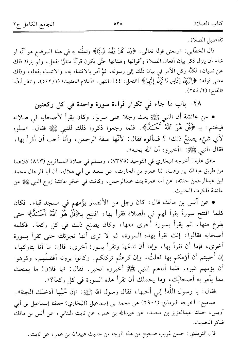 • عن أنس بن مالك قال: كان رجل من الأنصار يؤمهم في مسجد قباء. فكان كلما افتتح سورةً يقرأ لهم في الصلاة فقرأ بها، افتتح بـ {قُلْ هُوَ اللَّهُ أَحَدٌ} حتى يفرغ منها، ثم يقرأ بسورة أخرى معها، وكان يصنع ذلك في كل ركعة. فكلمه أصحابه فقالوا: إنك تقرأ بهذه السورة، ثم لا ترى أنها تجزئك حتى تقرأ بسورة أخرى، فإما أن تقرأ بها، وإما أن تدعها وتقرأ بسورة أخرى، قال: ما أنا بتاركها، إن أَحببتم أن أؤمكم بها فعلتُ، وإن كرهُتم تركتكم. وكانوا يرونه أفضلَهم، وكرهوا أن يؤمهم غيره، فلما أتاهم النبي - صلى الله عليه وسلم - أخبروه الخبر، فقال: "يا فلان! ما يمنعك مما يأمر به أصحابك، وما يحملك أن تقرأ هذه السورة في كل ركعة؟ ".