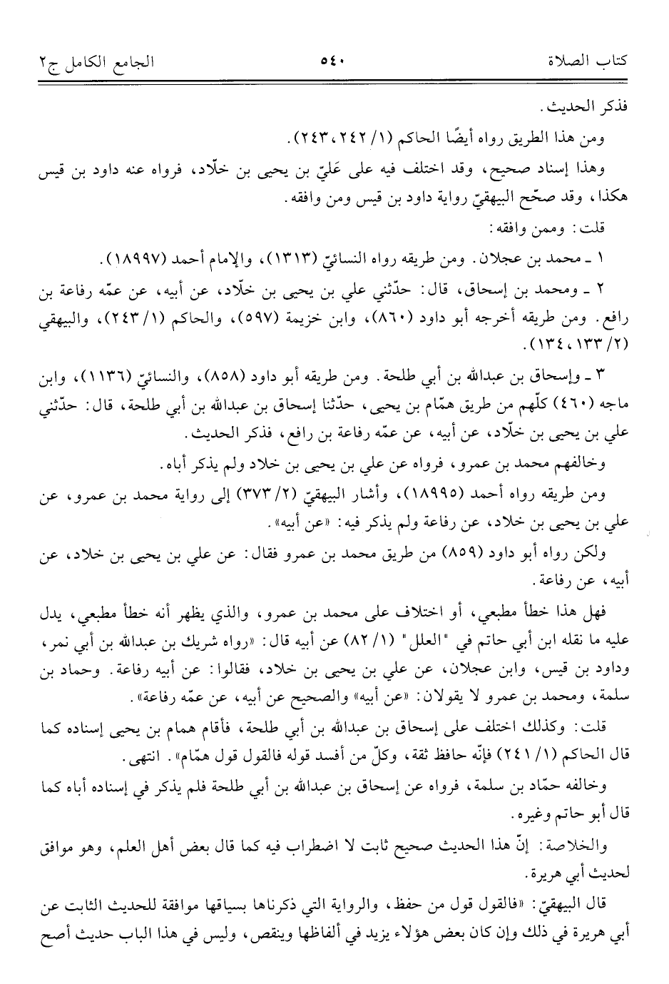 ٢ - ومحمد بن إسحاق، قال: حَدَّثَنِي عليّ بن يحيى بن خلَّاد، عن أبيه، عن عمّه رفاعة بن رافع. ومن طريقه أخرجه أبو داود (٨٦٠)، وابن خزيمة (٥٩٧)، والحاكم (١/ ٢٤٣)، والبيهقي (٢/ ١٣٣، ١٣٤).