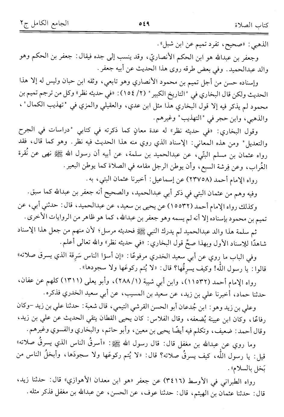 وقول البخاريّ: "في حديثه نظر" له عدة معانٍ كما ذكرته في كتابي "دراسات في الجرح والتعديل" ومن هذه المعاني: الإسناد الذي روي منه هذا الحديث فيه نظر. وهو كما قال، فقد رواه عثمان بن مسلم البتّي، عن عبد الحميد بن سلمة، عن أبيه أن رسول الله - صلى الله عليه وسلم - نهي عن نُقرة الغُراب، وعن فِرشة السبع، وأن يوطن الرّجل مقامه في الصّلاة كما يوطن البعير.