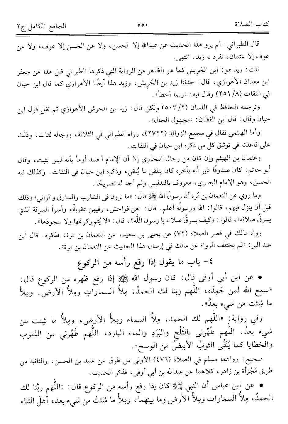 • عن ابن عباس أن النَّبِيّ - صلى الله عليه وسلم - كان إذا رفع رأسه من الركوع قال: "اللَّهُمَّ ربَّنا لك الحمدُ، مِلأُ السماوات ومِلأُ الأرض وما بينهما، ومِلأُ ما شئتَ من شيء بعد، أهلَ الثناء