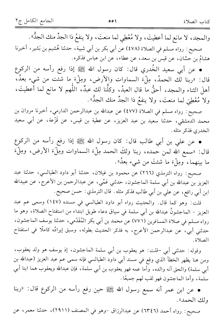 • عن أبي سعيد الخُدريّ قال: كان رسول الله صلى الله عليه وسلم إذا رفع رأسه من الركوع قال: "ربنا لك الحمدُ، مِلْءَ السماوات والأرض، ومِلْءَ ما شئت من شيء بعدُ، أهلَ الثناء والمجد، أحقُّ ما قال العبدُ، وكلُّنا لك عبدٌ، اللَّهُمَّ لا مانع لما أعطيتَ، ولا مُعْطِيَ لما منعتَ، ولا ينفعُ ذا الجدِّ منك الجدُّ".
