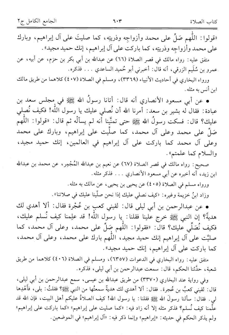 • عن عبد الرحمن بن أبي ليلى قال: لقيني كعب بن عُجْرة فقال: ألا أهدي لك هديةً؟ إن النبي - صلى الله عليه وسلم - خرج علينا فقلنا: يا رسول الله! قد علمنا كيف نُسلم عليك، فكيف نُصَلِّي عليك؟ قال: "فقولوا: اللهم صَلِّ على محمد، وعلى آل محمد، كما صليَّت على آل إبراهيم إنك حميد مجيد، اللَّهم بارك على محمد، وعلى آل محمد، كما باركت على آل إبراهيم، إنك حميد مجيد".