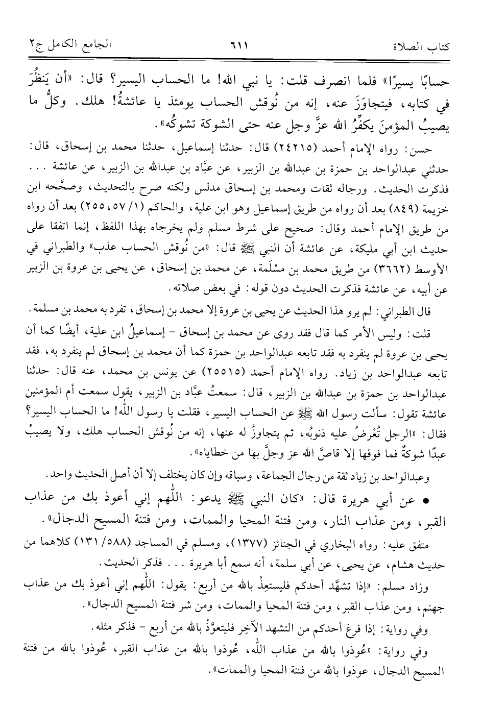 حسن: رواه الإمام أحمد (٢٤٢١٥) قال: حدثنا إسماعيل، حدثنا محمد بن إسحاق، قال: حدثني عبد الواحد بن حمزة بن عبد الله بن الزبير، عن عبَّاد بن عبد الله بن الزبير، عن عائشة ... فذكرت الحديث. ورجاله ثقات ومحمد بن إسحاق مدلس ولكنه صرح بالتحديث، وصحَّحه ابن خزيمة (٨٤٩) بعد أن رواه من طريق إسماعيل وهو ابن علية، والحاكم (١/ ٥٧، ٢٥٥) بعد أن رواه من طريق الإمام أحمد وقال: صحيح على شرط مسلم ولم يخرجاه بهذا اللفظ، إنما اتفقا على حديث ابن أبي مليكة، عن عائشة أن النبي - صلى الله عليه وسلم - قال: "من نُوقش الحساب عذب" والطبراني في الأوسط (٣٦٦٢) من طريق محمد بن مسْلَمة، عن محمد بن إسحاق، عن يحيى بن عروة بن الزبير عن أبيه، عن عائشة فذكرت الحديث دون قوله: في بعض صلاته.