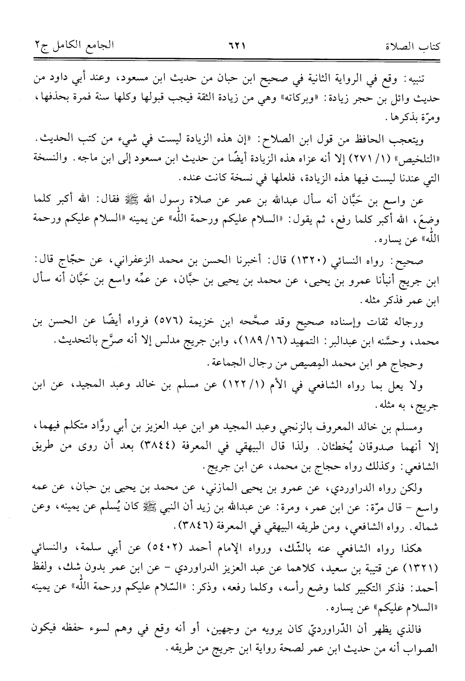عن واسع بن حَبَّان أنه سأل عبد الله بن عمر عن صلاة رسول الله صلى الله عليه وسلم فقال: الله أكبر كلما وضعَ، الله أكبر كلما رفع، ثم يقول: "السلام عليكم ورحمة الله عن يمينه "السلام عليكم ورحمة الله" عن يساره.