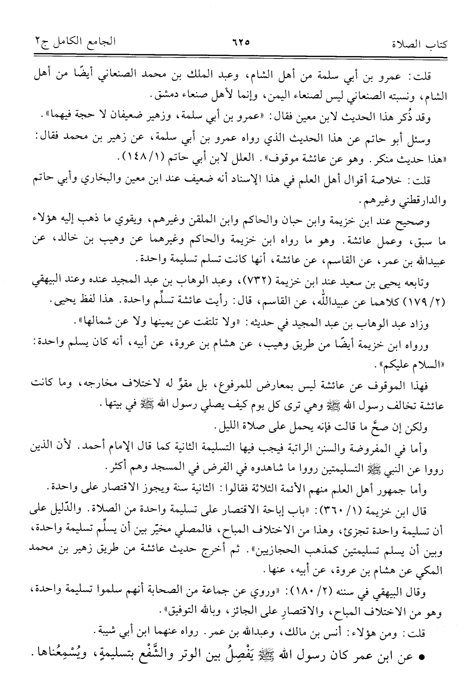 وصحيح عند ابن خزيمة وابن حَبَّان والحاكم وابن الملقن وغيرهم، ويقوي ما ذهب إليه هؤلاء ما سبق، وعمل عائشة. وهو ما رواه ابن خزيمة والحاكم وغيرهما عن وهيب بن خالد، عن عبيد الله بن عمر، عن القاسم، عن عائشة، أنها كانت تسلم تسليمة واحدة.