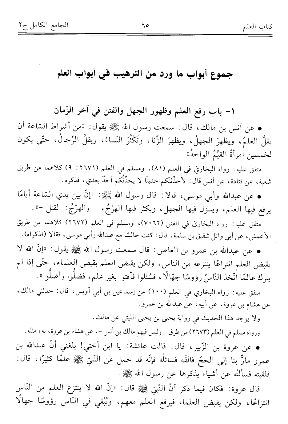 • عن عبد اللَّه بن عمرو بن العاص: قال سمعت رسول اللَّه -صلى اللَّه عليه وسلم- يقول: "إنّ اللَّه لا يقبض العلم انتزاعًا ينتزعه من النّاس، ولكن يقبض العلم بقبض العلماء، حتّى إذا لم يترك عالمًا اتّخذ النّاسُ رؤوسًا جهّالًا، فسُئلوا فأفتوا بغير علم، فضلُّوا وأضلُّوا".