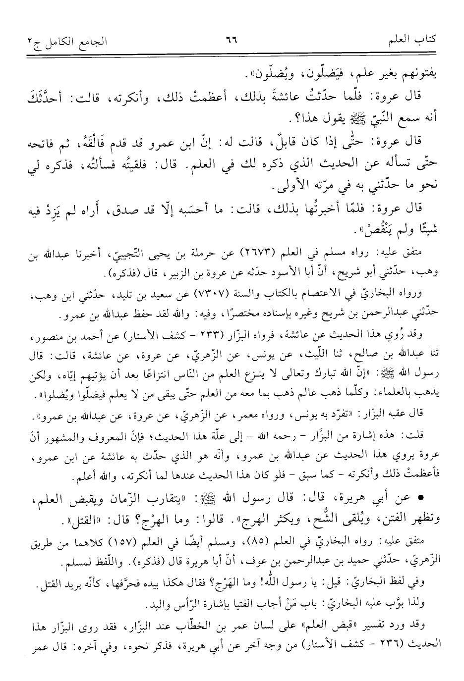 قال عروة: حتّى إذا كان قابلٌ، قالت له: إنّ ابن عمرو قد قدم فَالْقَه، ثم فاتحه حتّى تسأله عن الحديث الذي ذكره لك في العلم. قال: فلقيتهُ فسألُه، فذكره لي نحو ما حدّثني به في مرّته الأولى.