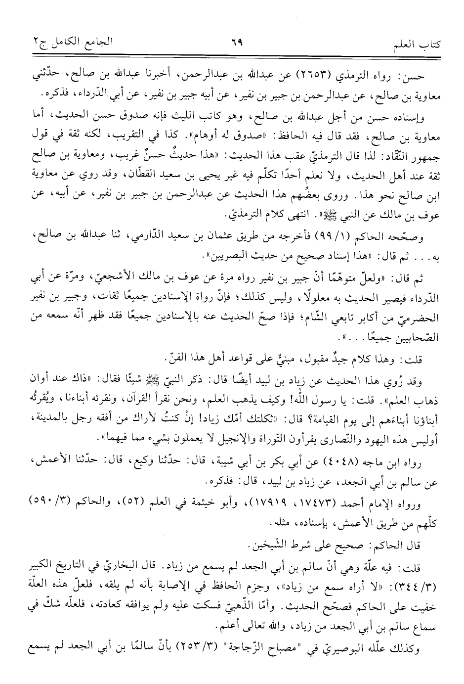 حسن: رواه الترمذيّ (٢٦٥٣) عن عبد اللَّه بن عبد الرحمن، أخبرنا عبد اللَّه بن صالح، حدّثني معاوية بن صالح، عن عبد الرحمن بن جبير بن نفير، عن أبيه جبير بن نفير، عن أبي الدّرداء، فذكره.