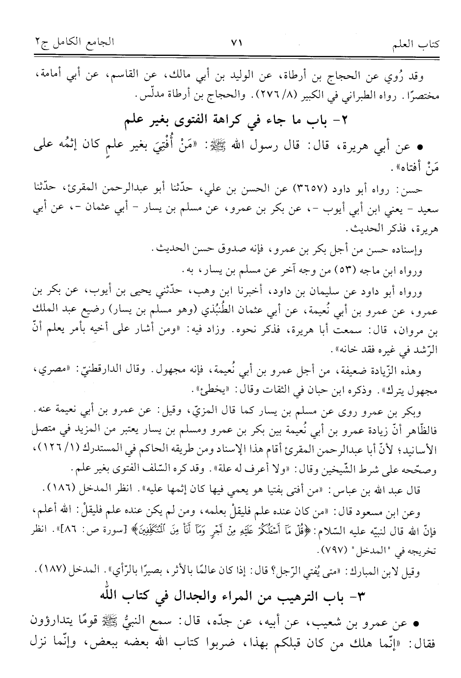 وبكر بن عمرو روي عن مسلم بن يسار كما قال المزيّ، وقيل: عن عمرو بن أبي نعيمة عنه. فالظّاهر أنّ زيادة عمرو بن أبي نُعيمة بين بكر بن عمرو ومسلم بن يسار يعتبر من المزيد في متصل الأسانيد؛ لأنّ أبا عبد الرحمن المقرئ أقام هذا الإسناد ومن طريقه الحاكم في المستدرك (١/ ١٢٦)، وصحّحه على شرط الشّيخين وقال: "ولا أعرف له علة". وقد كره السّلف الفتوى بغير علم.