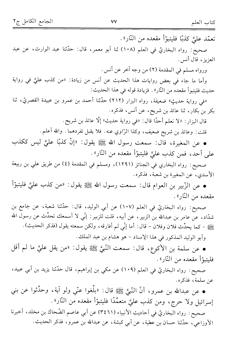 • عن الزّبير بن العوام قال: سمعت رسول اللَّه -صلى اللَّه عليه وسلم- يقول: "من كذب عليَّ فليتبوّأ مقعده من النّار".