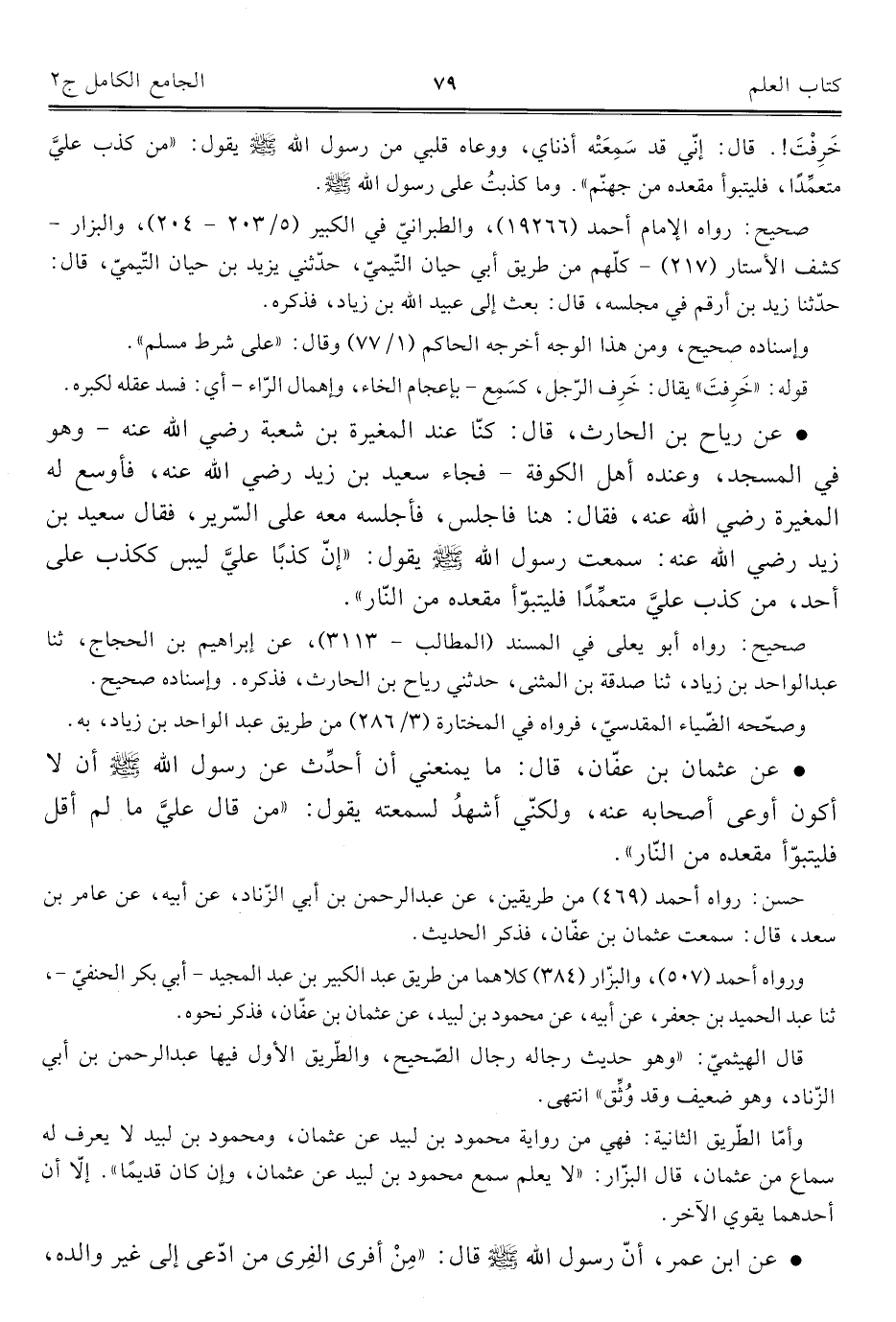 • عن رياح بن الحارث، قال: كنّا عند المغيرة بن شعبة رضي اللَّه عنه -وهو في المسجد، وعنده أهل الكوفة- فجاء سعيد بن زيد رضي اللَّه عنه، فأوسع له المغيرة رضي اللَّه عنه، فقال: هنا فاجلس، فأجلسه معه على السّرير، فقال سعيد بن زيد رضي اللَّه عنه: سمعت رسول اللَّه -صلى اللَّه عليه وسلم- يقول: "إنّ كذبًا عليَّ ليس ككذب على أحد، من كذب عليَّ متعمِّدًا فليتبوّأ مقعده من النّار".