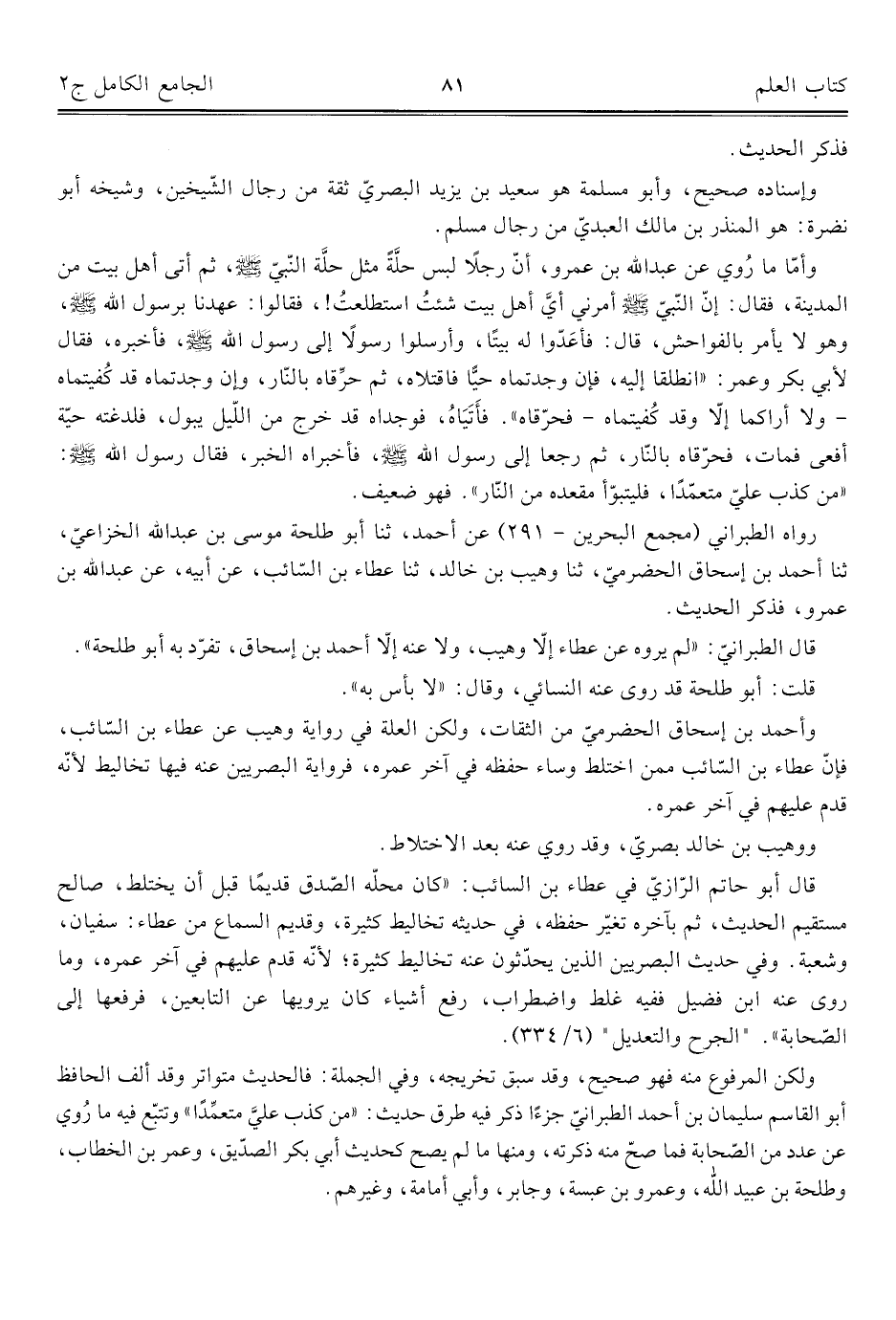 ولكن المرفوع منه فهو صحيح، وقد سبق تخريجه، وفي الجملة: فالحديث متواتر وقد ألف الحافظ أبو القاسم سليمان بن أحمد الطبرانيّ جزءًا ذكر فيه طرق حديث: "من كذب عليَّ متعمِّدًا" وتتبّع فيه ما رُوي عن عدد من الصّحابة فما صحّ منه ذكرته، ومنها ما لم يصح كحديث أبي بكر الصدّيق، وعمر بن الخطّاب، وطلحة بن عبيد اللَّه، وعمرو بن عبسة، وجابر، وأبي أمامة، وغيرهم.