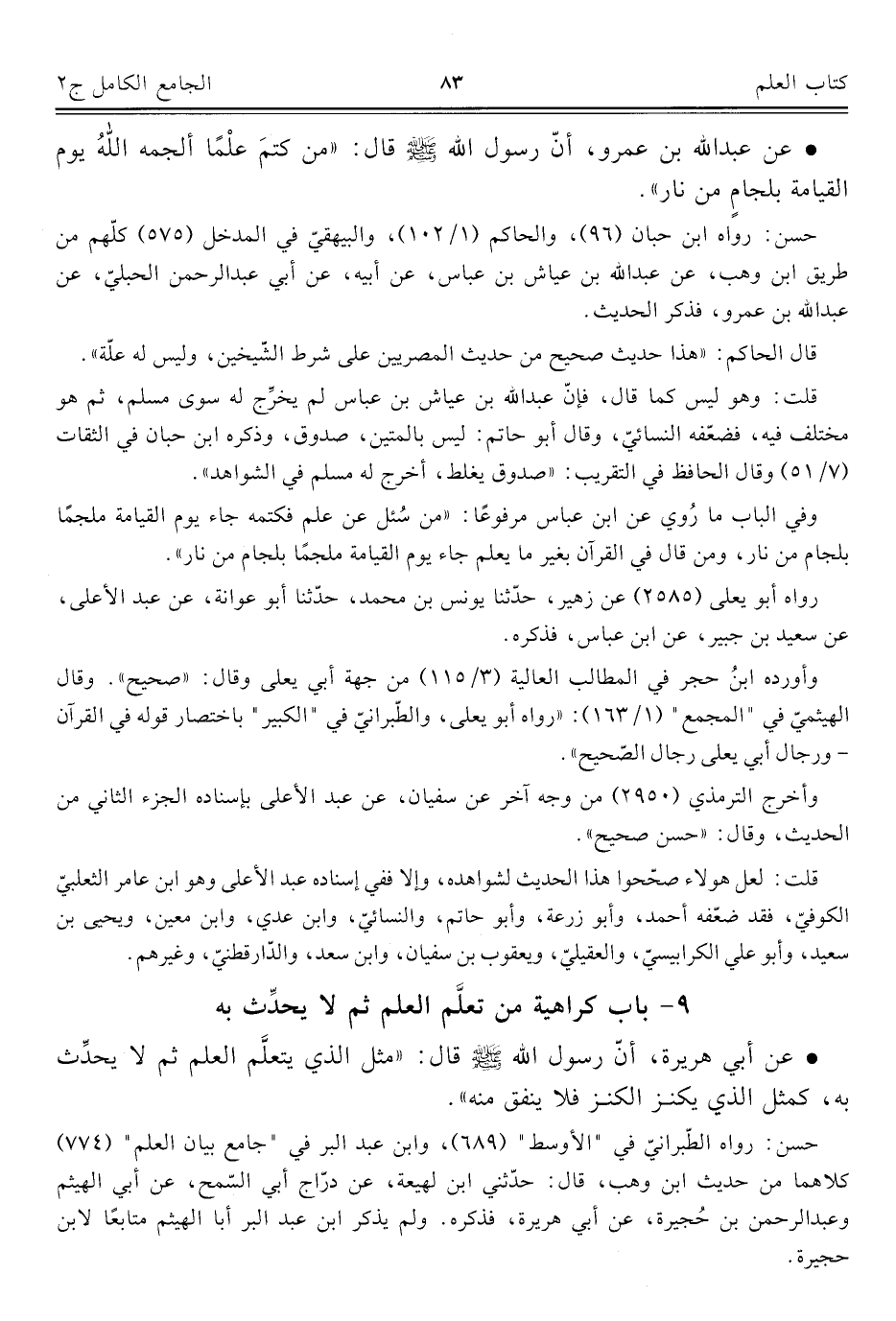 • عن عبد اللَّه بن عمرو، أنّ رسول اللَّه -صلى اللَّه عليه وسلم- قال: "من كتمَ علْمًا ألجمه اللَّهُ يوم القيامة بلجامٍ من نار".