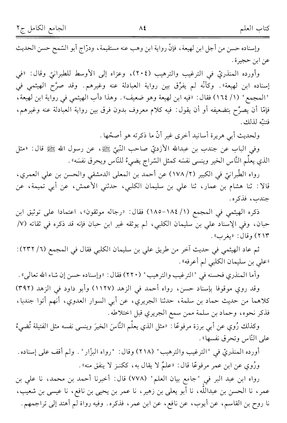 وأورده المنذريّ في الترغيب والترهيب (٢٠٤)، وعزاه إلى الأوسط للطبرانيّ وقال: "في إسناده ابن لهيعة". وكأنَّه لم يفرِّق بين رواية العبادلة عنه وغيرهم. وقد صرَّح الهيثميّ في "المجمع" (١/ ١٦٤) فقال: "فيه ابن لهيعة وهو ضعيف". وهذا دأب الهيثميّ في رواية ابن لهيعة، فإمّا أن يصرِّح بضعيفه أو أن يقول: فيه كلام معروف بدون فرق بين رواية العبادلة عنه وغيرهم، فتنّبه لذلك.