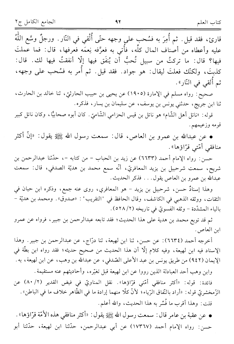 • عن عبد اللَّه بن عمرو بن العاص، قال: سمعتُ رسول اللَّه -صلى اللَّه عليه وسلم- يقول: "إنّ أكثر منافقي أمّتي قرّاؤها".