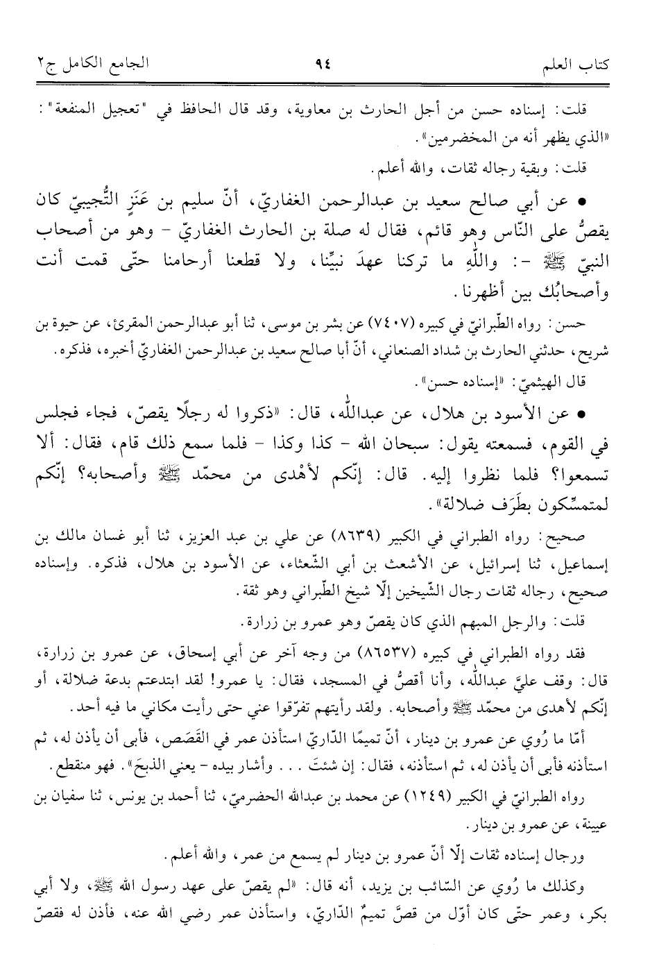 فقد رواه الطبرانيّ في كبيره (٨٦٥٣٧) من وجه آخر عن أبي إسحاق، عن عمرو بن زرارة، قال: وقف علي عبد اللَّه، وأنا أقصُّ في المسجد، فقال: يا عمرو! لقد ابتدعتم بدعة ضلالة، أو إنكم لأهدى من محمّد -صلى اللَّه عليه وسلم- وأصحابه. ولقد رأيتهم تفرّقوا عني حتّى رأيت مكاني ما فيه أحد.