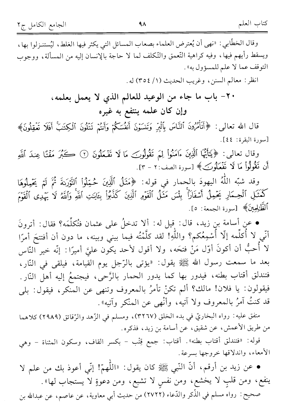 ٢٠ - باب ما جاء من الوعيد للعالم الذي لا يعمل بعلمه، وإن كان علمه ينتفع به غيره