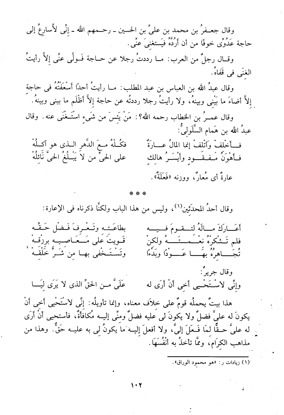 هذا بيتٌ يحمله قومٌ على خلاف معناه، وإنما تأويله: إني لأستحيي أخي ان يكون له عليّ فضل ولا يكون لي عليه فضل زمني إليه مكافأةٌ، فأستحيي أن أرى له عليّ حقاً لما فعل إليّ، ولا أفعل إليه ما يكون لي به عليه حقٌّ. وهذا من مذاهب الكرام، وممّا تأخذ له أنفسها.