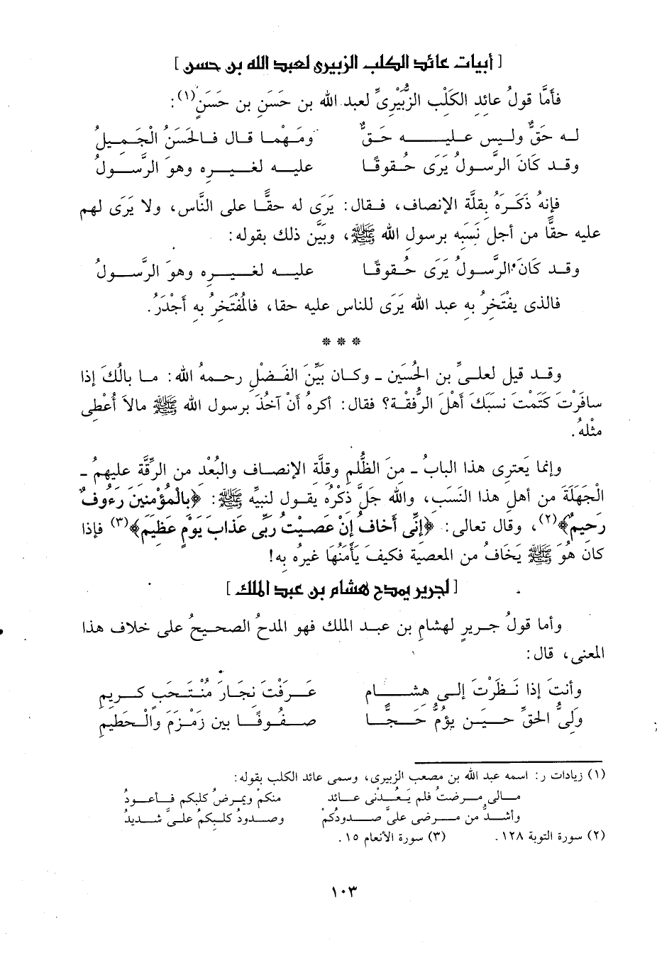 وإنما يعتري هذا الباب من الظلم وقلّة الإنصاف والبعد من الرّقّة عليهم الجهلة من أهل هذا النسب، والله جلّ ذكره يقول لنبيّه صَلَّى اللَّهُ عَلَيْهِ وَسَلَّمَ: {بِالْمُؤْمِنِينَ رَؤُوفٌ رَحِيمٌ} 2، وقال تعالى: {إِنِّي أَخَافُ إِنْ عَصَيْتُ رَبِّي عَذَابَ يَوْمٍ عَظِيمٍ} 3، فإذا كان هو صَلَّى اللَّهُ عَلَيْهِ وَسَلَّمَ يخاف من المعصية فكيف يأمنها غيره به!