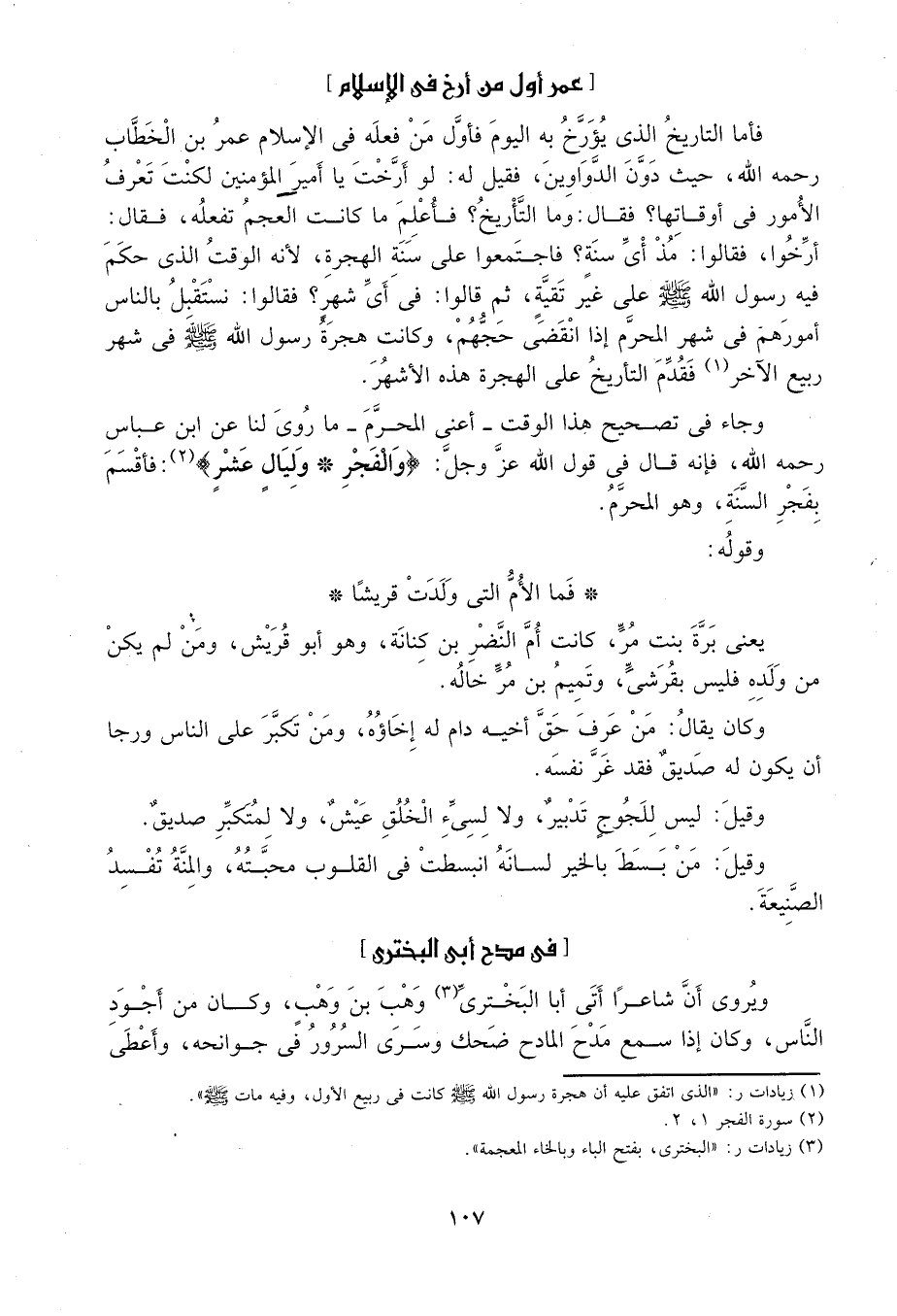 فأما التاريخ الذي يؤرخ به اليوم فأول من فعله في الإسلام عمر بن الخطاب رحمه الله. حيث دون الدواوين، فقيل له: لو أرخت يا أمير المؤمنين لكنت تعرف الأمور في أوقاتها? فقال: وما التأريخ? فأعلم ما كانت العجم تفعله، فقال: أرخوا؛ فقالوا: مذ أي سنة? فاجتمعوا على سنة الهجرة، لأنه الوقت الذي حكم فيه رسول الله صَلَّى اللَّهُ عَلَيْهِ وَسَلَّمَ على غير تقيةٍ ثم قالوا: في أي شهرٍ? فقالوا: نستقبل بالناس أمورهم في شهر المحرم إذا انقضى حجهم، وكانت هجرة رسول الله صَلَّى اللَّهُ عَلَيْهِ وَسَلَّمَ في شهر بيع الآخر1 فقدم التأريخ على الهجرة هذه الأشهر.