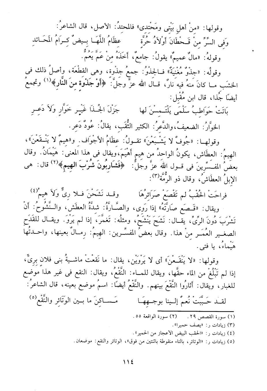 وقولها: "جوف لا يشبعن" تقول: عزاك الأجواف. و"هيم لا ينقعن"، الهيم: العطاش، يكون الواحد من هيم أهيم، ويقال في هذا المعنى: هيمان. وقال بعض المفسرين في قول الله عز وجل: {فَشَارِبُونَ شُرْبَ الْهِيمِ} 2 قال: هي الإبل العطاش، وقال ذو الرمة3: