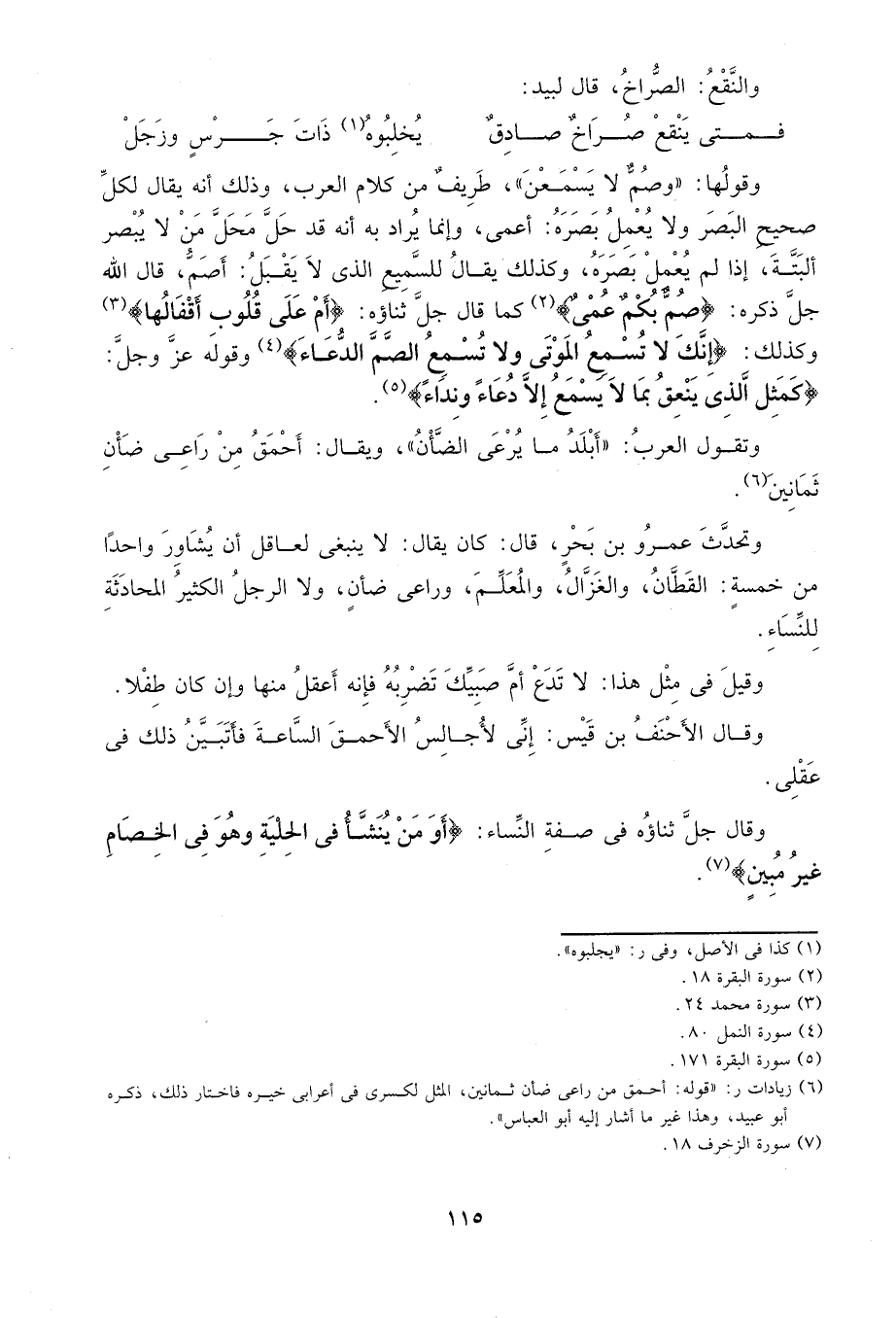 وقولها: "وصم لا يسمعن"، طريف من كلام العرب، وذلك أنه يقال لكل صحيح البصر ولا يعمل بصره: أعمى، وإنما يراد به أنه قد حل محل من لا يبصر البتة، إذا لم يعمل بصره، وكذلك يقال للسميع الذي لا يقبل: أصم، قال الله جلَّ ذكرهِ: {صُمٌّ بُكْمٌ عُمْيٌ} 2 كما قال جل ثناؤه: {أَمْ عَلَى قُلُوبٍ أَقْفَالُهَا} 3 وكذلك: {إِنَّكَ لا تُسْمِعُ الْمَوْتَى وَلا تُسْمِعُ الصُّمَّ الدُّعَاءَ} 4 وقوله عز وجل: {كَمَثَلِ الَّذِي يَنْعِقُ بِمَا لا يَسْمَعُ إِلَّا دُعَاءً وَنِدَاء} 5