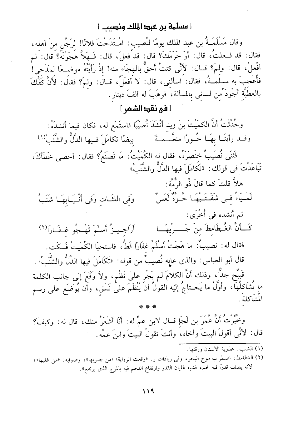 فثنى نصيب خنصره، فقال له الكميت: ما تصنع? فقال: أحصي خطأك، تباعدت في قولك: "تكمل فيها الدل والشنب".