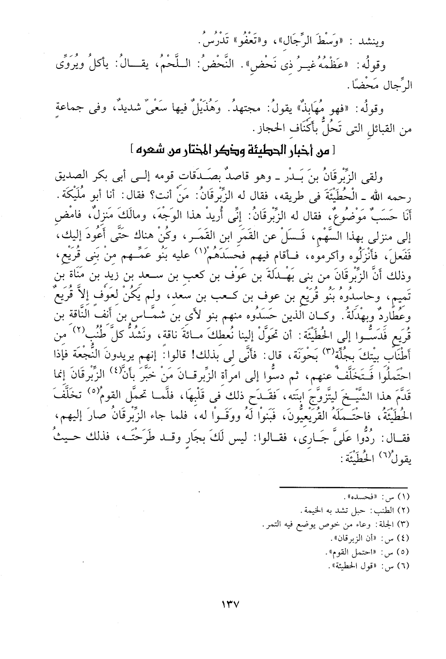 ولقي الزبرقان بن بدر - وهو قاصد بصدقات قومه إلى أبي بكر الصديق رحمه الله - الحطيئة في طريقه، فقال له الزبرقان: من أنت? فقال: أنا أبو مليكة، أنا حسب موضوع، فقال له الزبرقان: إني أريد هذا الوجه، ومالك منزلٌ، فامض إلى منزلي بهذا السهم، فسل عن القمر بن القمر، وكن هناك حتى أود إليك، ففعل فأنزلوه وأكرموه، فأقام فيهم فحسدهم1 عليه بنو عمهم من بني قريع، وذلك أن الزبرقان من بني بهدلة بن عوف بن كعب بن سعدٍ بن زيد مناة بن تميم، وحاسدوه بنو قريع بن عوف بن كعب بن سعدِ، ولم يكن لعوف إلا قريقع وعطارد وبهدلة. وكان الذين حسدوه منهم بنو لأي بن شماس بن أنف الناقة بن قريع فدسوا إلى الحطيئة: أن تحول إلينا نعطط مائة ناقةٍ، ونشد كل طنب2 من أطناب بيتك بجلة3 بحونةٍ، قال: فأنى لي بذلك! قالوا: إنهم يريدون النجعة فإذا احتملوا فتخلف عنهم، ثم دسوا إلى امرأة الزبرقان من خبر بأن4 الزبرقان إنما قدم هذا الشيخ ليتزوج ابنته، فقدح ذلك في قلبها، فلما تحمل القوم5 تخلف الحطيئة، فاحتمله القريعيون، فبنوا له ووقوا له، فلما جاء الزبرقان صار إليهم، فقال: ردوا علي جاري، فقالوا: ليس لك بجارٍ وقد طرحته؛ فذلك حيث يقول6 الحطيئة: