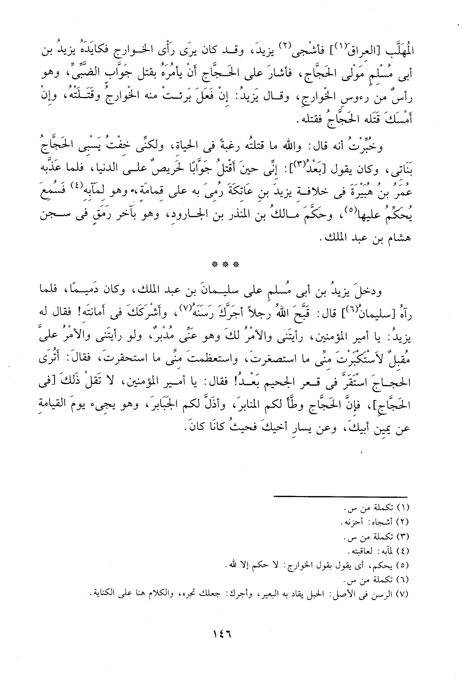 المهلّب [العراق1] فأشجى2 يزيد، وقد كان يرى رأي الخوارج فكايده يزيد بن أبي مسلم مولى الحجاج، فأشار على الحجاج أن يأمره بقتل جوّاب الضّبّيّ، وهو رأس من رؤوس الخوارج، وقال يزيد: إن فعل برئت منه الخوارج وقتلته، وإن أمسك قتله الحجاج، فقتله.