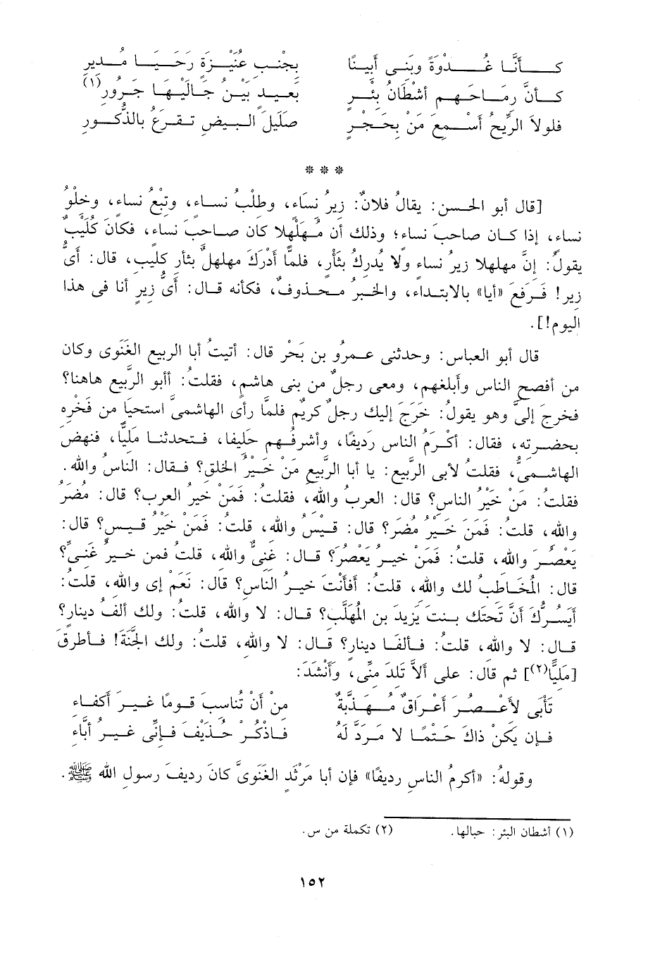 قال أبو العباس: وحدثني عمرو بن بحر قال: أتيت أبا الربيع الغبوي وكان من أفصح الناس وأبلغهم، ومعي رجل من بني هاشم، فقلت: أبو الرّبيع ههنا? فخرج إليّ وهو يقول: خرج إليك رجل كريم. فلمّا رأى الهاشميّ استحيا من فخره بحضرته، فقال: أكرم الناس رديفاً وأشرفهم حليفاً. فتحدثنا ملياً، فنهض الهاشمي، فقلت لأبي الربيع: يا أبا الربيع من خير الخلق? فقال: الناس والله، فقلت: من خير الناس? قال: العرب والله، فقلت: فمن خير العرب? قال: مضر والله، قلت: فمن خير مضر? قال: قيس والله، قلت: فمن خير قيس? قال: يعصر والله، قلت: فمن خير يعصر? قال: غنيّ والله، قلت: فمن خير غنيّ? قال: المخاطب لك والله، قلت: أفأنت خير الناس? قال: نعم إي والله، قلت: أيسرّك أن تحتك بنت يزيد بن المهلب? قال: لا والله، قلت: ولك ألف دينار? قال: لا والله? قلت: فألفا دينار? قال: لا والله، قلت: ولك الجنّة! فأطرق [مليّاً2] ثم قال: على ألاّ تلد منّي، وأنشد:
