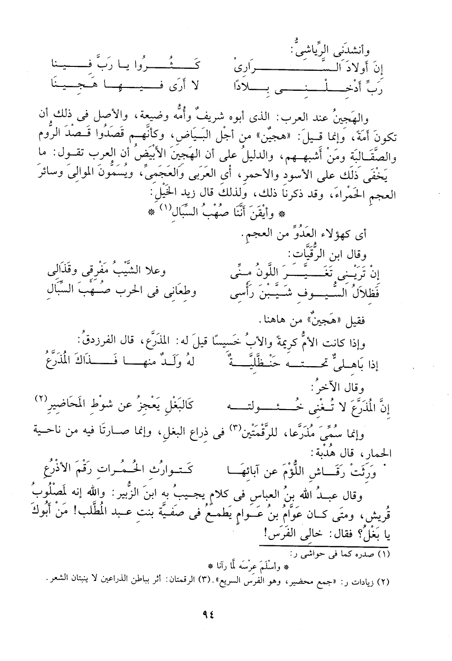 والهجين عند العرب: الذي أبوه شريفٌ وأمّه وضيعة?، والأصل في ذلك أن تكون أمّةً، وإنما قيل: "هجين" من أجل البياض، وكأنهم قصدوا قصد الرّوم والصّقالبة ومن أشبههم، والدليل على أن الهجين الأبيض أن العرب تقول: ما يخفى ذلك على الأسود والحمر، أي العربي والعجميّ، ويسمّون الموالي وسائر العجم الحمراء، وقد ذكرنا ذلك، ولذلك قال زيد الخيل: