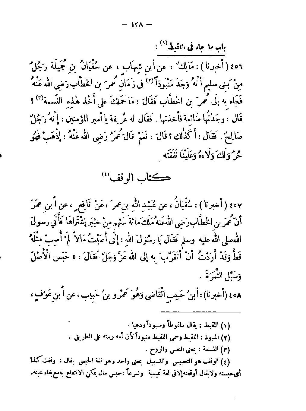 -أنَّ عُمَرَ بنَ الخَطَّاب رضيَ اللَّهُ عنْهُ مَلَكَ مَائةَ سَهْم مِنْ خيْبَر إشْتَراهاَ فأَتَي رسولِ اللَّه صلى اللَّهُ عَلَيْه وسلم فَقَالَ يَا رسُولُ اللَّهِ: إنِّي أَصَبْتُ مَالاً لَمْ أُصِبْ مِثْلَهُ قطُّ وَقَدْ أَرَدْتُ أنْ أتَقَرَّبَ بِه إلى اللَّه عَزَّوَجَلَّ فَقالَ: "حَبّس الأَصْلَ وَسَبَّلَ الثَّمَرَةَ.