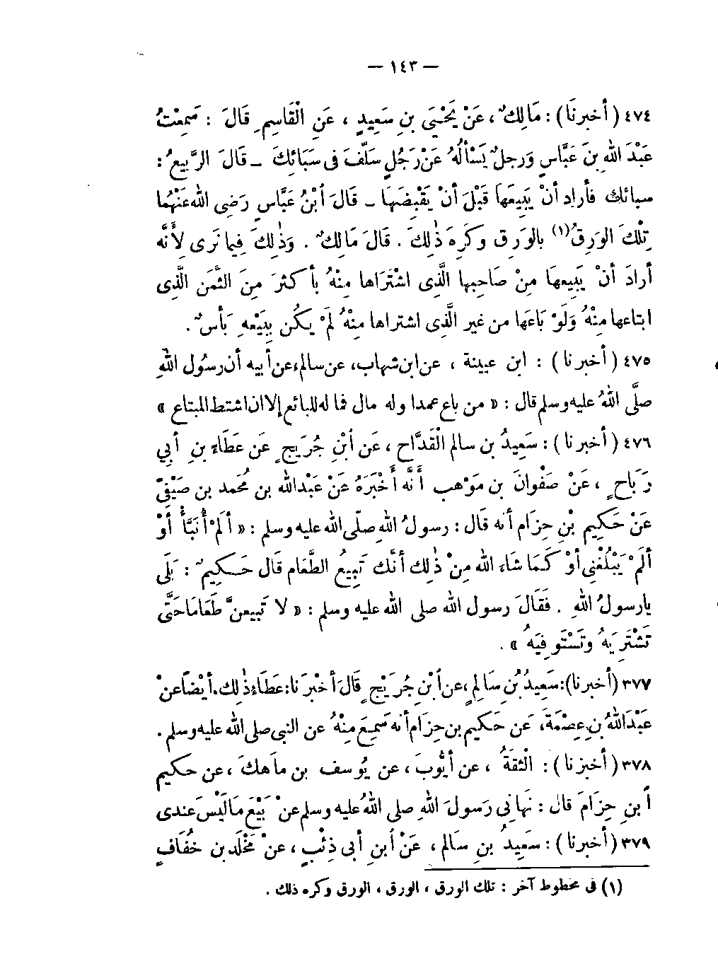 -سَمِعْتُ عَبْدَ اللَّهِ بنَ عَبَّاسٍ وَرجلٌ يَسْألُهُ عَنْ رَجُلٍ سَلّفَ في سَبَائِكَ قَالَ الرَّبيعُ: سبائك فأراد أنْ يَبِيعَهَا قَبْلَ أنْ يَقْبِضَهَا قَالَ ابْنُ عَبَّاسٍ رضِي اللَّه عَنْهُما تِلْكَ الوَرِقُ (في مخطوط آخر: تلك الورق الورق الورق وكره ذلك) بالوَرِق وكَرِهَ ذلِكَ قَالَ مَالِكٌ وَذَلِكَ فِيما نَرى لأَنَّه أرادَ أنْ يَبِيعَهَا مِنْ صَاحِبها الَّذِي اشْتَرَاها مِنْهُ بأكثرَ مِنَ الثَّمَن الَّذِي ابتاعها مِنْهُ وَلَوْ بَاعَهَا من غير الَّذِي اشتَرَاها مِنْهُ لَمْ يكُن بِبَيْعِهِ بَأسٌ.