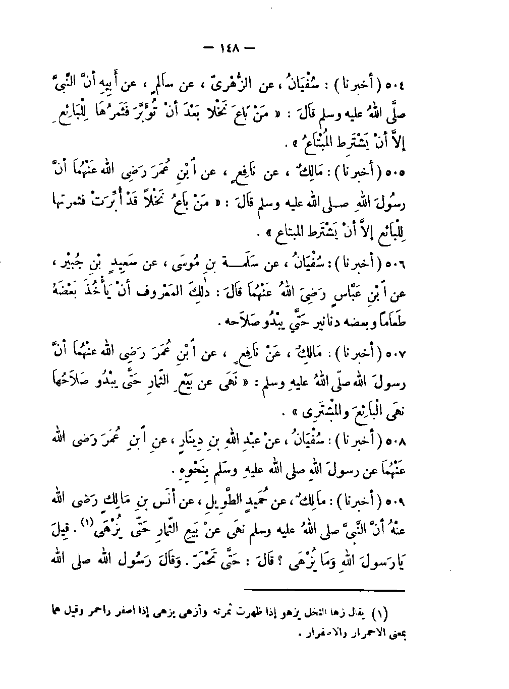 -أَنَّ النَّبيَّ صلَّى اللَّهُ عليه وسلم نَهَى عن بَيْعِ الثّماَرِ حَتَّى يُزْهَى (يقال زهى النخل يزهو إذا ظهرت ثمرته وأزهى يزهي إذا اصفر واحمر وقيل هما بمعنى الإحمرار والإصفرار) قِيلَ يَا رَسُولَ اللَّهِ وَمَا يُزْهَى؟ قَالَ: حَتَّى تَحْمَرّ وَقَالَ رَسُولَ اللَّهِ صلَّى اللَّهُ -[149]- عليه وسلم: «أرَأَيْتُمْ إذَا مَنَع اللَّهُ الثَّمَرَةَ فَبِمَ يَأخُذُ أحَدُكُمْ مَالَ أخيه» .