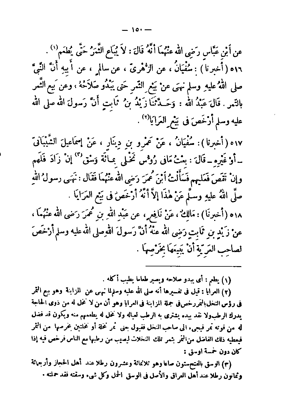 -أنَّ النَّبيَّ صلَّى اللَّهُ عليه وسلم نهَى عنْ بَيْعِ الثّمرِ حَتَّى يَبْدُو صَلاَحُه وعن بيع الثمر بالتمر قَالَ عَبْدُ اللَّه: وَحَدَّثَنَا زَيْدُ بنُ ثابِتٍ أنّ رَسُولَ اللَّهِ صلَّى اللَّهُ عليه وسلم أرخَصَ في بَيْعِ العَرَايَا (العرايا: قيل تفسيرها أنه صلَّى اللَّهُ عليه وسلم لما نهى عن المزابنة وهو بيع الثمر في رؤس النخل بالتمر رخص في جملة المزابنة في العرايا وهو أن من لا نخل له من ذوي الحاجة يدرك الرطب ولا نقد بيده يشتري به الرطب لعياله ولا نخل له يطعمهم منه ويكون قد فضل له من قوته تمر فيجئ إلى صاحب النخل فيقول بعني ثمر نخلة أو نخلتين بخرصها من الثمر فيعطيه ذلك الفاضل من التمر بثمر تلك النخلات ليصيب من رطبها مع الناس فرخص فيه إذا كان دون خمسة أوسق) .
