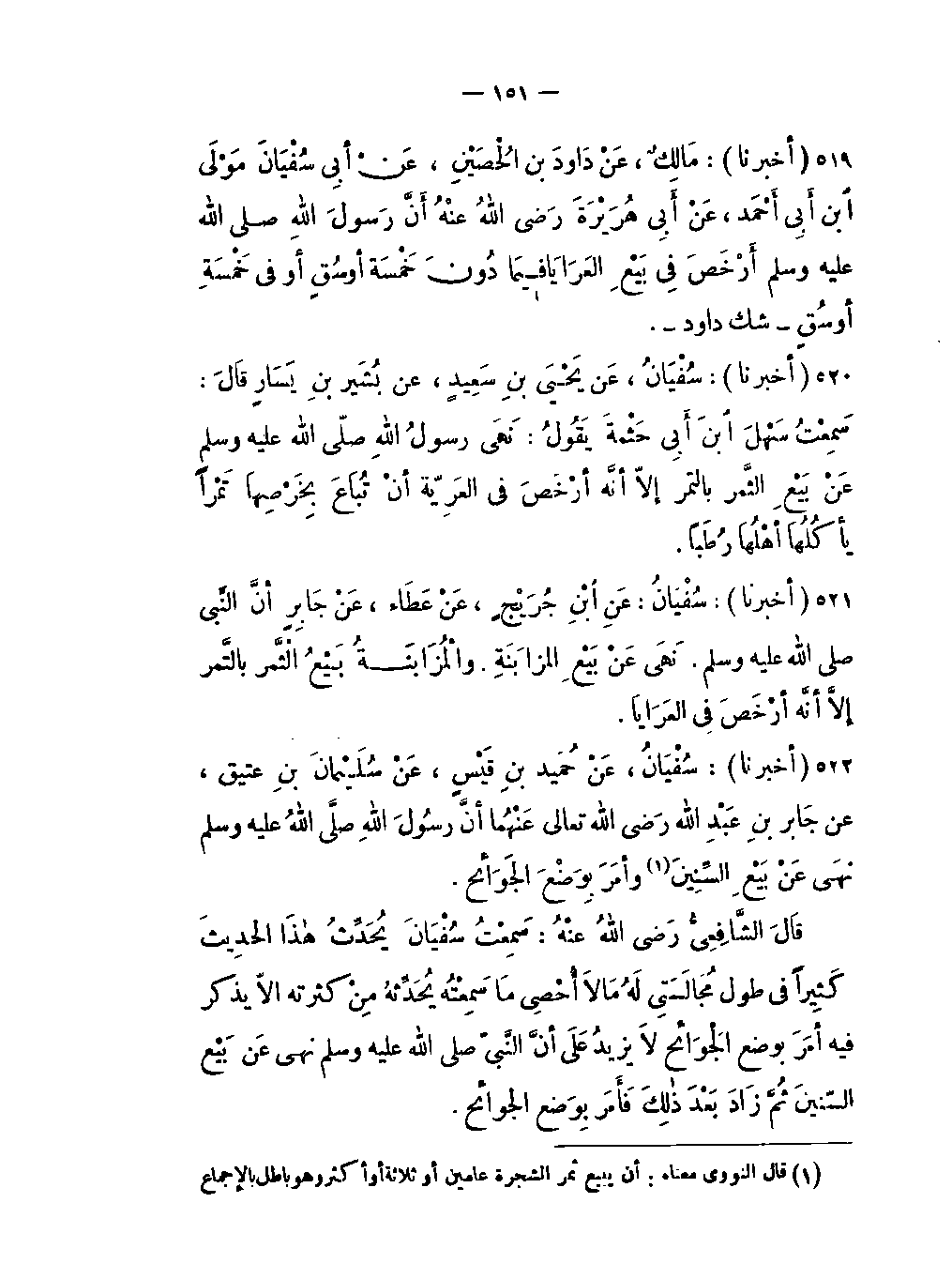 قالَ الشَّافِعيُّ رَضِيَ اللَّه عَنْهُ: سَمِعْتُ سُفْيَانَ يُحَدِّثُ هذَا الحديثَ كَثيراً في طول مُجَالَسَتي لَهُ مَالاَ أُحْصِي مَا سَمِعْتُه يُحَدِّثهُ مِنْ كَثرته إلا يذكر فيه أمَرَبوضع الجَوائح لاَ يزيدُ عَلَى أنَّ النَّبيَّ صلَّى اللَّهُ عليه وسلم نهَى عنْ بَيْعِ السّنينَ ثُمَّ زَادَ بَعْدَ ذلِكَ فَأَمَرَ بِوَضع الجوائح. -[152]-