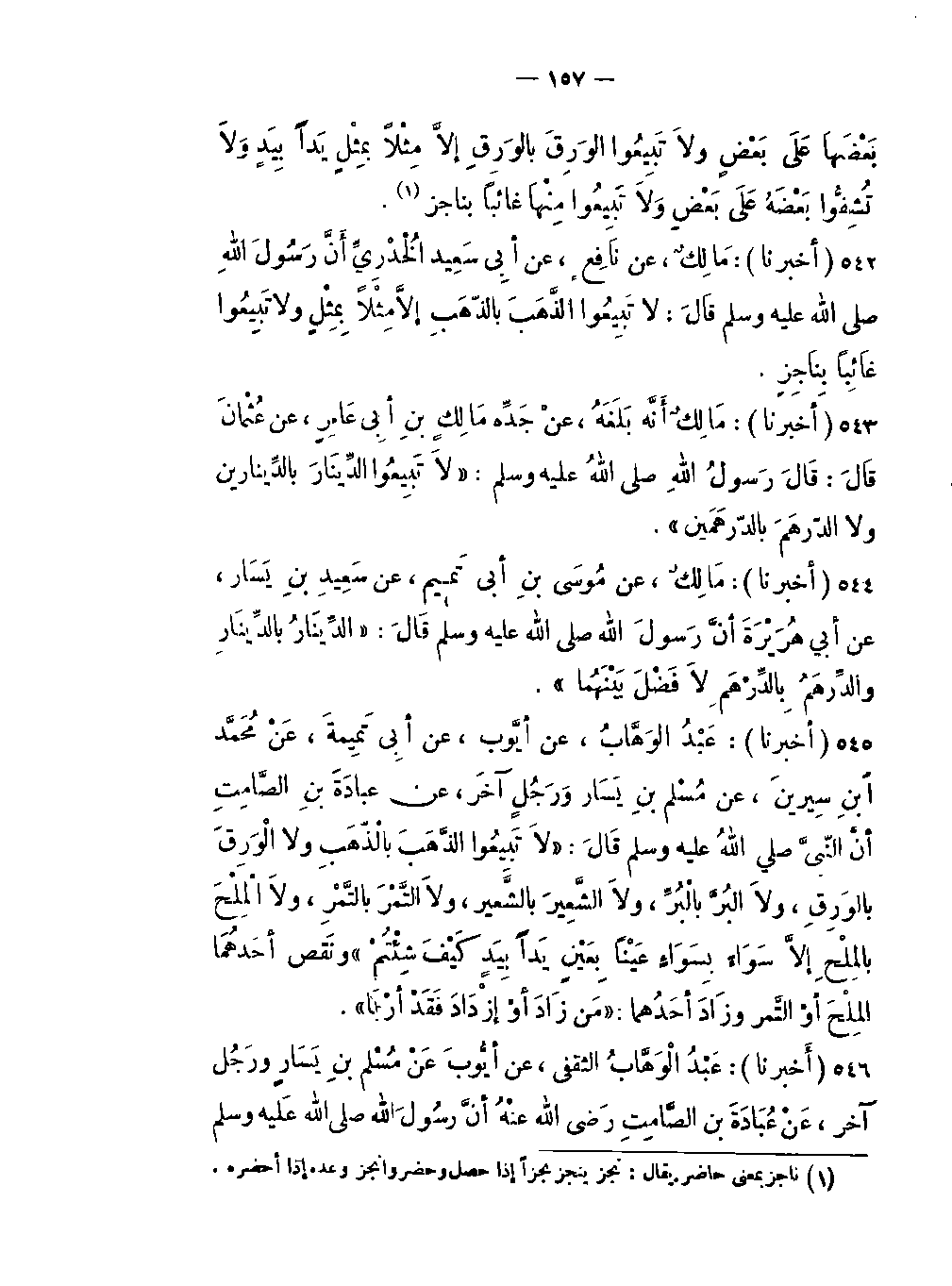 -أنَّ رَسُولَ اللَّهِ صلَّى اللَّهُ عليه وسلم -[158]- قَالَ: «لاَ تَبِيعُوا الذَّهبُ بالذَّهب، ولاَ الوَرِقِ بالوَرِقِ، ولاَ البُرُّ بالبُرِّ، ولاَ والشَّعِير بالشَّعير، ولاَ التَّمْرَ بِالتَّمْرِ، ولا الْمِلْحَ بالمِلْحِ إلاَّ سَوَاءً بِسَوَاءٍ عَيْناً بِعَيْنٍ يَداً بِيَدٍ ولكِنْ بِيعُوا الذَّهَبَ بالوَرِقِ والوَرِق بالذَّهَبِ والبُرُّ بالشَّعير، والشَّعِير بالبُرِّ، والتَّمْرَ بالمِلْحِ، والْمِلْحَ بِالتَّمْرِ، يَداً بِيَدٍ كَيْفَ شِئْتُمْ» ونَقص أحَدُهُما التَّمْرَ أوْ الْمِلْحَ.