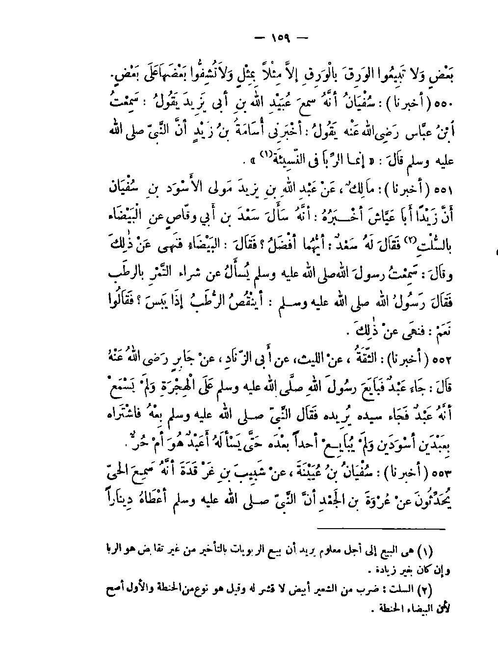 -سَمِعْتُ ابْنُ عَبَّاسٍ رَضِيَ اللَّهُ عنْهُ يَقُولُ: أخْبَرنِي أُسَامَةُ بنُ زَيْدٍ أنَّ النّبيَّ صلَّى اللَّهُ عليه وسلم قَالَ: " إنما الرِّبَا في النّسِيئةَ (هي البيع إلى أجل معلوم يريد أن بيع الربويات بالتأخير من غير تقابض هو الربا وإن كان بغير زيادة) .