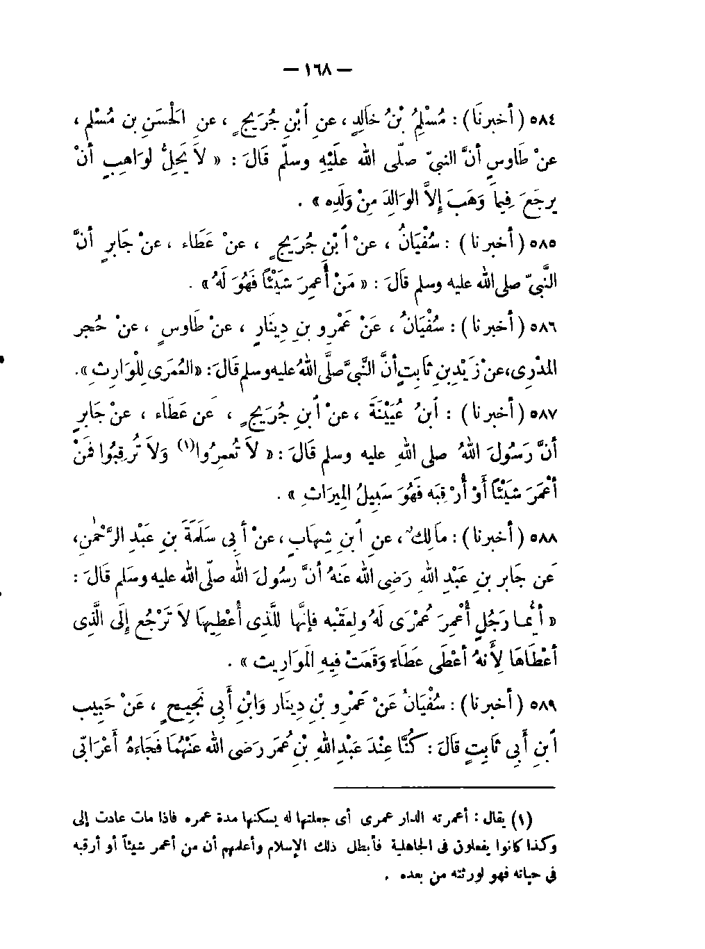 -كُنَّا عِنْدَ عَبْدِ اللَّهِ بنِ عُمرَ رَضِيَ اللَّه عَنْهُما فَجَاءَهُ أَعْرَابّي -[169]- فَقَالَ لَهُ: إنِّي أعْطَيْتُ بَعْضَ بَنيّ نَاقَةً حَيَاتَهُ قَالَ عَمْرٌو وَفِي الحديثِ وأنّها تَنَاتَجتَ وَقَالَ ابْنُ أبِي نُجيحٍ فِي حَدِيثِهِ وأنّها أضَنَّتَ (قال الهروي والخطابي هكذاروى والصواب ضنت أي كثر أولادها) وضْطَرَبَتْ فَقَالَ: هيَ لَهُ حَيَاتَه ومَوْتَهُ، قَالَ: فَإِنِّي تَصَدَّقْتُ بِهَا عَلَيْهِ قَالَ: فَذلِكَ أَبْعَدُ لَكَ مِنْهاَ.