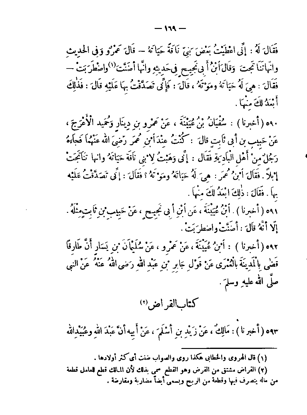 كتاب القراض (القراض مشتق من القرض وهو القطع سمي بذلك لأن المالك قطع للعامل قطعة من ماله يتصرف فيها وقطعة من الربح ويسمى أيضاً مضاربة ومقارضة) .