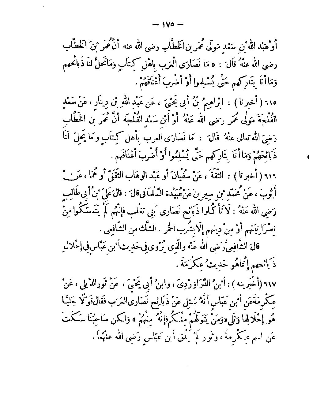 -قَال عَليِّ بْنِ أَبِي طَالِبٍ رضِي اللَّه عَنْهُ: لاَ تَأكُلوا ذَبَائح نَصَارَى بَنِي تَغْلب فإِنَّهُم لَمْ يَتَمَسّكُوا مِنْ نِصْرَانِيَتهم أوْ مِنْ دِينهم إِلاّ بِشُرْبِ الخمر الشَّك من الشّافعي.