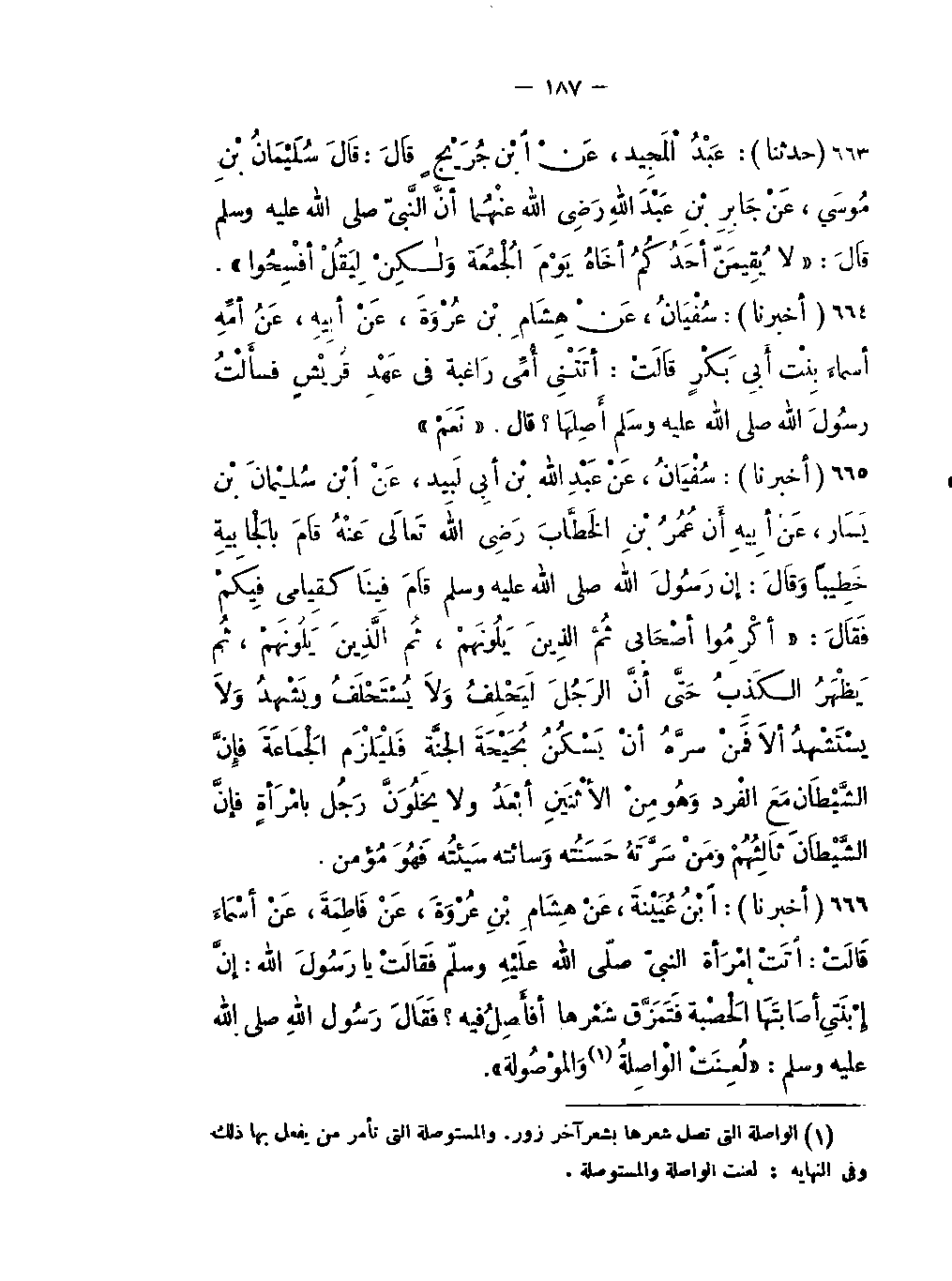 -أتَتْ امْرَأة النبيّ صلى اللَّه عليه وسلم فَقَالَتْ يا رَسُولَ اللَّه: إنَّ إِبْنَتِي أصَابَتْهاَ الْحَصْبَة فَتَمَزَّق شَعْرها أفأَصِلُ فيه؟ فَقَال رَسُولَ اللَّه صلى اللَّه عليه وسلم: " لُعِنَتْ الوَاصِلَةُ (الواصلة التي تصل شعرها بشعر آخر زور والمستوصلة التي تأمر من يفعل بها ذلك وفي النهاية: لعنت الواصلة والمستوصلة) وَالْمَوْصُولة ".