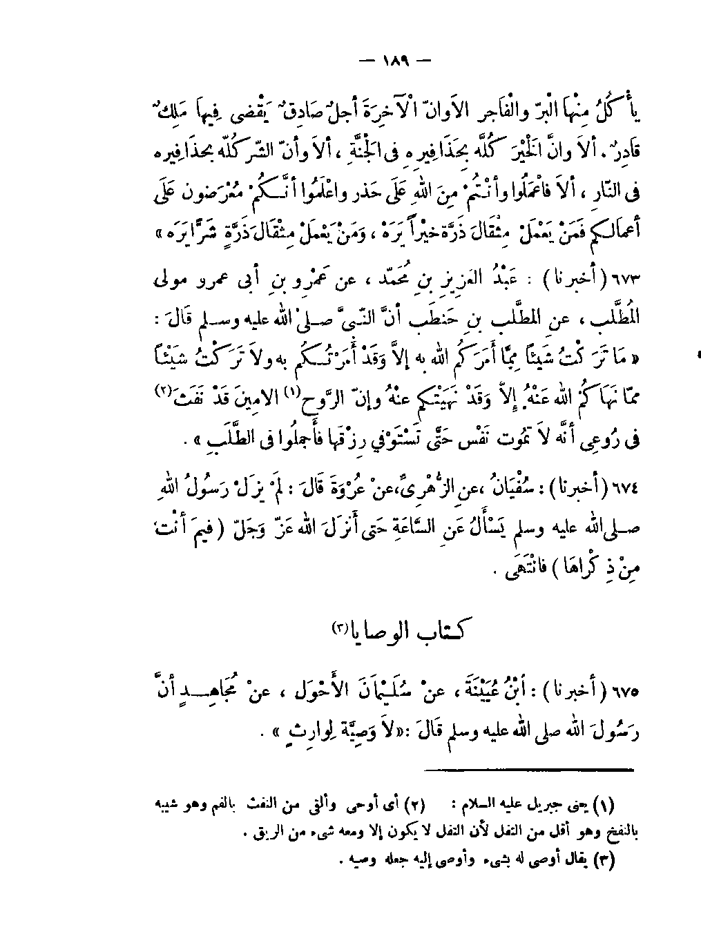 -أنَّ النَّبيَّ صلى اللَّه عليه وسلم قَالَ: «مَا تَرَكْتُ شَيْئاً مِمَّا أَمَرَكُم اللَّه به إلاَّ وَقَدْ أَمَرْتُكُمْ به ولاَ تَرَكْتُ شَيْئاً مِمَّا نَهَاكُم اللَّه عَنْهُ إلاَّ وَقَدْ نَهَيْتُكُم عَنْهُ وإنّ الرَّوح (يعني جبريل عليه السلام) الأمِينَ قَدْ نَفَثَ (أي أوحى وألقى من النفث بالفم وهو شبيه بالنفخ وهو أقل من التفل لأن التفل لا يكون إلا ومعه شئ من الريق) في رُوعِي أنَّه لاَ تمُوت نَفْس حَتَّى تَسْتَوْفِي رِزْقَها فأَجملُوا في الطَّلَبِ» .