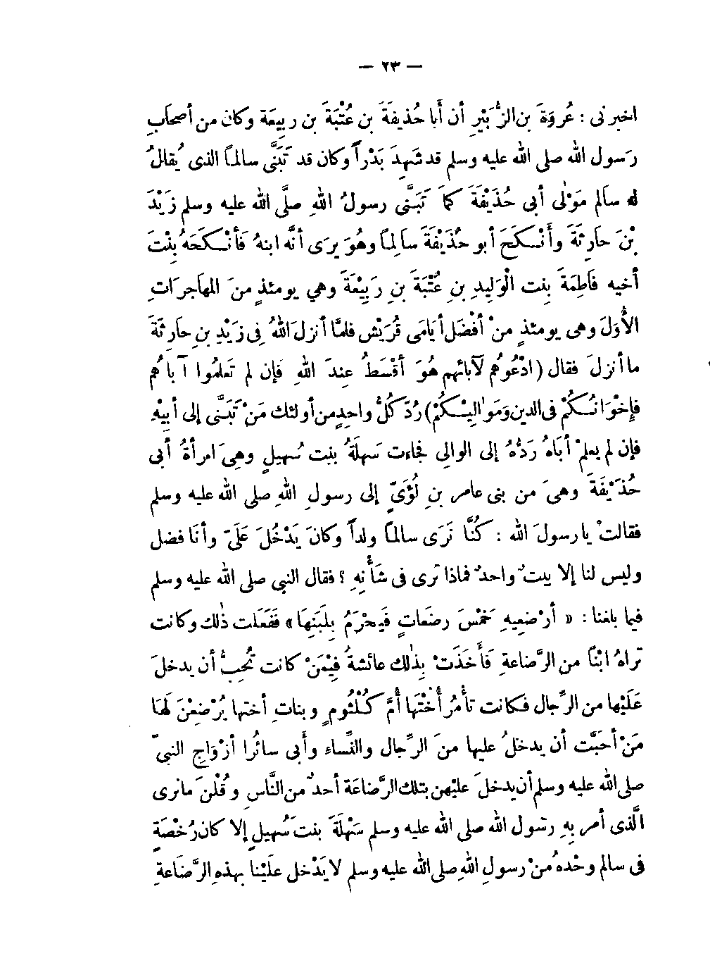 -أخبرني: عُرْوَةَ بن الزُّبَيْر أن أبا حُذَيْفَةَ بن عُتْبَةَ بن ربيعَة وكان من أصحَابِ رَسُولَ اللَّهِ صَلَّى اللَّه عليه وسلَّم قد شَهِدَ بدْراً وكان قد تَبَنَّى سالماً الذي يُقالُ له سالم مَوْلَى أبي حُذَيْفَةَ كما تَبَنَّى رَسُولُ اللَّهِ صَلَّى اللَّه عليه وسلَّم زَيْدَ بنَ حارِثَةَ وأَنْكَحَ أبو حُذَيْفَةَ سالماً وهُوَ يَرَى أنَّهُ ابنهُ فَأنْكَحَهُ بِنْتَ أخيه فاطِمَةَ بِنت الْوَلِيدِ بنِ عُتْبَةَ بنِ رَبِيعَةَ وهي يؤمئذٍ منَ المهَاجِرَاتِ الأُوَلَ وهي يومئذٍ من أفْضَل أيَامَى قُرَيْشٍ فلمَّا أنزلَ اللَّهُ فِي زَيْدِ بنَ حارِثَةَ ما أنزلَ فقال (أدْعُوهُم لآبائهم هُوَ أقْسَطُ عندَ اللَّهِ لئن لم تَعْلمُوا آباؤهُم فإخْوَانُكُمْ في الدين ومواليكمْ) رُدّ كُلُّ واحِدٍ من أولئك مَنْ تَبَنَّى إلى أبِيْهِ فإن لم يعْلَمْ أبَاهُ رَدُّهُ إلى الوالِي فجاءت سَهْلَةَ بنتَ سُهَيْلٍ وهي امرأةُ أبي حُذَيْفَةَ وهيَ من بني عامر بنِ لُؤَيٍّ إلى رَسُولَ اللَّهِ صَلَّى اللَّه عليه وسلَّم فقالتْ يا رسول اللَّه: كُنَّا نَرَى سَالماً ولداً وكانَ يَدْخُلَ عَلَيّ وأنَا فضل وليس لنا إلا بيتٌ واحدٌ فماذا ترى في شَأْنِهِ؟ فقال النبيَّ صَلَّى اللَّه عليه وسلَّم فيما بلغنا: «أرْضِعيهِ خَمْسَ رضَعاتٍ فيُحْرَمُ بلَبَنِهَا» ففَعَلَتْ ذلك وكانتْ تَراهُ ابْناً من الرَّضَاعةِ فَأَخَذَتْ بِذَلِك ائشةُ فِيْمَنْ كانت تُحِبُّ أن يدخلَ عَلَيْهَا من الرِّجال فكانت تأْمُر أُخْتَها أُمَّ كُلْثُومٍ وبناتِ أختها يُرْضِعْنَ لَهَا مَنْ أحَبَّت أن يدخلَ عَلَيْهَا من الرِّجال والنِّسَاءِ وأَبى سائُرا أزْوَاجِ النبيَّ صَلَّى اللَّه عليه وسلَّم أن يدخلَ عَلَيْهن بتلك الرَّضَاعَة أحدٌ من النَّاسِ وقُلْنَ ما نَرى الَّذي أمر بِهِ رَسُولَ اللَّهِ صَلَّى اللَّه عليه وسلَّم سَهْلَةَ بنتَ سُهَيْلٍ إلا كان رُخْصَةٍ في سالم وحْدهُ منْ رَسُولَ اللَّهِ صَلَّى اللَّه عليه وسلَّم لا يَدْخُل علَيْنا بهذه الرَّضَاعةِ